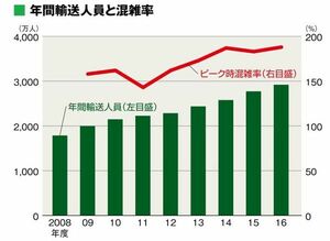国土交通省が毎年発表する鉄道の混雑率。東京メトロ東西線やJR総武線各駅停車などが上位の常連だが、2017年発表の2016年度分ではワースト5に「新顔」が入った。東京都交通局(都営)の新交通システム「日暮里・舎人ライナー」だ。同年度のデータでは、朝ラッシュ時の混雑率は最大188%。混雑路線として知られるJR中央線快速や東急田園都市線よりも高い。