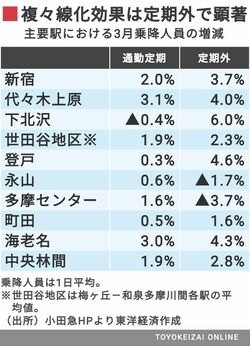 一方で、新宿寄りの駅では、代々木上原が通勤定期3.1%増、定期外4.0%増、下北沢が通勤定期0.4%減、定期外6.0%増という結果となった。また、梅ヶ丘―和泉多摩川間の各駅をまとめた平均は通勤定期が1.9%増、定期外が2.3%増だった。いずれも年間平均より高く、ダイヤ改正の効果が顕著に出ているといえる。下北沢の通勤定期が前年同月比マイナスとなっているのが気になるが、「期間が短いため突出した数字になっているのかもしれない」(広報部)としている。一方で、今まで下北沢で京王井の頭線に乗り換えて渋谷方面に向っていた人が、下北沢で下車せずそのまま千代田線に乗り入れて表参道方面に向ったということも考えられる。だとしたら、小田急にとって悪い話ではない。