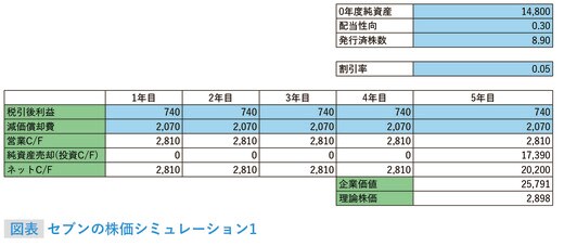 理論株価は2898円である。この決算時点のセブンの証券市場での株価は4500円程度であり、理論株価はかなり低めに出ている。