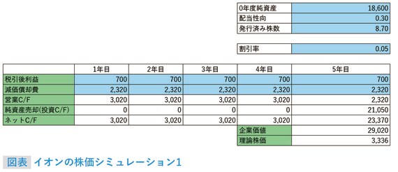 理論株価は3336円となる。この決算時点の証券市場でのイオンの株価は1700円程度であり、今度は証券市場の株価のほうが大幅に安い。ただこの1700円のほうが異常値と言える。イオンの純資産は現状で18600億円である。