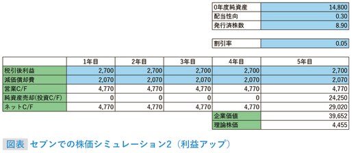 ここでセブンの中計を見ると「営業利益を4500億円にする」(ゴール時点はよくわからない)としている。そこで実効税率を40%と仮定して、5年間の税引後利益を2700億円として入れてみる。結果は4455円となり、証券市場の株価と同等になる。