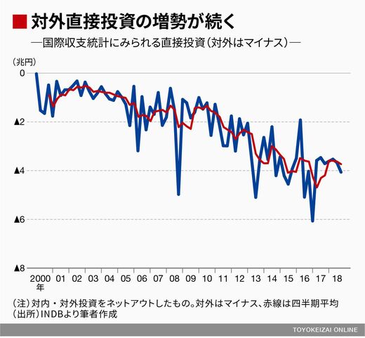 一方で、企業の余資に限りがある以上、海外投資の増加は国内投資の減少と表裏一体だ。賃上げも含めた日本企業の消費・投資意欲の乏しさがデフレの一要因だと指摘されていることを踏まえれば、旺盛なFDIは日本経済にとって悲しい事実でもある。日本の対外純資産は2017年末時点で27年連続世界一で、おそらく2018年末も同様と推測されるが、それは国内よりも海外に有望な投資機会があったことの結果である。(FDIの拡大については、筆者記事『「世界最大債権国」日本、直接投資急拡大の必然」』でも議論したので参照頂きたい)。