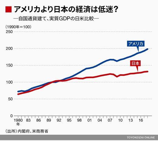 そこで、それぞれの自国通貨建てで1990年を基準にこれまでの変化を比較してみよう。この間にアメリカは実質GDPが約2倍に増えたのに、日本は3割程度増えただけだ。これを名目GDPで比較すると、物価が上昇を続けているアメリカの拡大に比べて、物価が上昇しない日本の伸びの低さはさらに著しいはずで、日本の経済成長率が低いことは明らかだ。