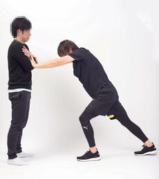 このスタートの感覚を身につけるメニューが「おやじドーン」。まず子どもの前に立ちます。お子さんは前に立っている人に向かってスーっと頭から倒れていって、その勢いで足を出し、相手を押していきます。