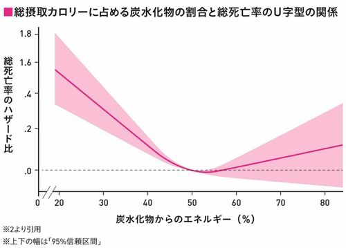 しかし、グラフのU字型の左側、炭水化物の割合が20%くらいまでは死亡率が上昇していることを見れば、さらに炭水化物を制限すれば体によいとは考えにくいでしょう。