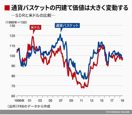 IMFの準備資産であるSDRは、1SDRが0.5825ドル、0.38671ユーロ、1.0174人民元、11.9円、0.085946ポンドで構成される通貨バスケットの価値とされている。例えば、この構成比の通貨バスケットを1単位の価値として採用する暗号通貨を作ったとすると、その円建ての価値は長期的には相当大きな変動をすることになる。