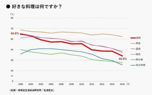 中でも落ち込みが著しいのが、定食の名脇役であるはずの漬物。「漬物が好き」と答えた人は、1998年の64.8%から、2018年には44.0%と、20.8ポイントも下落しています。