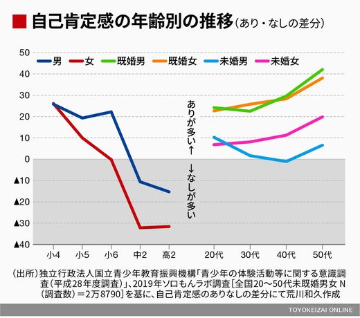 20代は女性より男性の方がまだ自己肯定感が高いのですが、30代以降は完全に逆転します。つまり、未成年時代は男子の方が自己肯定感が高く、成人すると女性の方が高くなるのです。一方で、既婚者で見ると、男女差はほとんどありません。