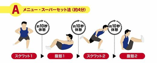 より時短で集中して一気に行いたい場合は「スーパーセット」で。スーパーセットとは、異なる部位の2つの種目を10秒程度の短い休みで交互に行うという方法です。これなら同じ内容でも4分ほどで燃え尽きることができます。
