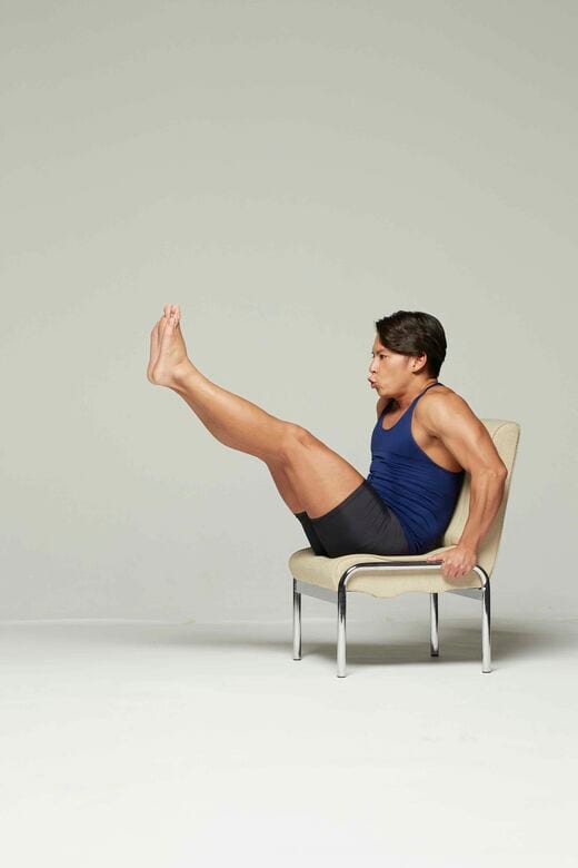 いすなどに腰掛けた姿勢で、足の上げ下ろしを繰り返します。足を上げる動作では、腰を丸めていくので、腹筋の下部を中心に足を振り出す腸腰筋と腿前の大腿直筋にも効きます。足を上げるときには「キュー」と声を出してしっかり上げ切ります。下ろす動作も丁寧に行ってください。