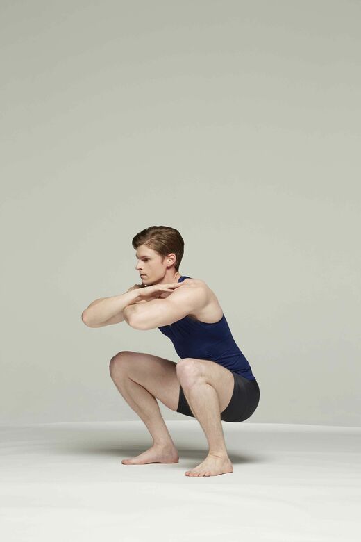 「30秒全力+10秒休息+20秒全力」と、時間を区切って速く高回数行うスクワットです。立ち上り切って休まずひたすら動きを繰り返します。筋肉に効かせるためにも、ケガの防止のためにも、下ろす動作はやや丁寧に行いましょう。