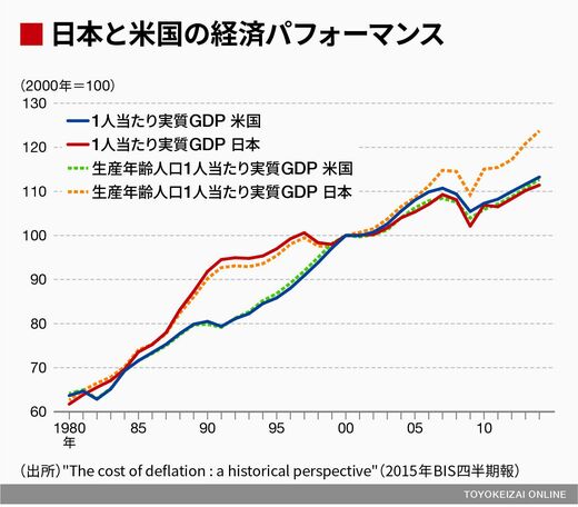 そして、図のようにかなり長いタイムスパンである1980年から今までの、人口1人当たり実質GDP、生産年齢人口1人当たり実質GDPを眺めてみると、アメリカと比べて、日本はけっこうがんばっているように見える。
