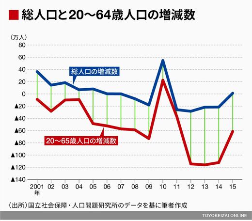 生産年齢人口1人当たり実質GDPのほうが1人当たり実質GDPよりもがんばっているように見えるのは、生産年齢人口の減少幅が総人口よりも大きいからである。次を見てもらいたい――生産年齢人口は国際標準(15~64歳)ではなく20~64歳でとっている。