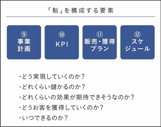 「転」では結果を示します。「承」で提案した解決案となる商品・サービスを、どうやって作り、流通させ、販売していくか、スケジュールも含め具体的な計画、そしてその計画を実行したらどうなるのかという結果について述べます。「転」でのゴールは「実現できる」「儲かる」ということを理解してもらうことです。「転」は、以下の4つの内容で構成します。