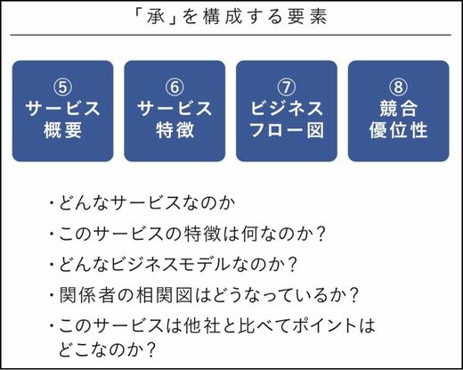 「承」では「解決案」について説明します。「起」で説明した可能性を秘めたマーケットが抱える課題をどのような方向で解決するのかについて述べます。「承」でのゴールは、「起」の内容を受けて、「これなら課題を解決できるかもしれない」「競合他社と差別化できるかもしれない」と希望を抱かせることです。「承」は、以下の4つで構成します。