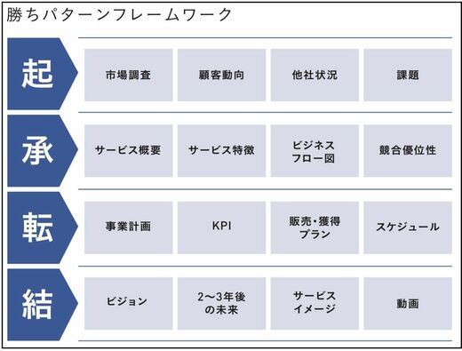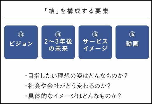 「起承転結」ストーリーの勝ちパターンは起「1〜4」、承「5〜8」、転「9〜12」、結「13〜16」の16要素を基本としています。これらの16の要素を一連の流れで組み立てプレゼンすることで、説得力を高めるフレームワークになっています。