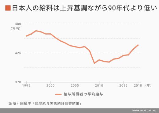 しかし、上がったといっても440万円。それはリーマンショック前の2007年当時の水準に近づいたにすぎない。さらに、1997年当時の467万円よりもまだ低い。周辺国が経済成長し給与も上昇している状況において、日本人の給与は相対的にも低い状態に陥りつつある。