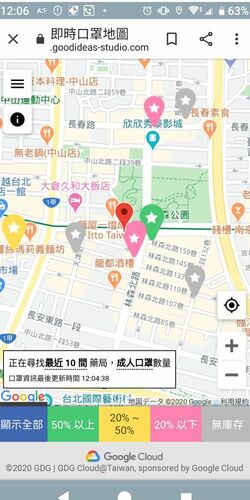マスクマップを実際に起動すると、購入者の端末の位置情報から近隣の特約薬局が表示され、在庫量も一目でわかるよう色分けされている。在庫量を見える化したことで、完全ではないものの、購入できないことへの不満は一定程度解消されているようだ。