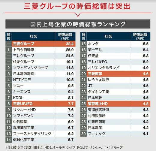 国内の時価総額ランキングをみると、50位以内に5社がランクイン。三菱UFJFGが8位(7.7兆円)、三菱商事が20位(4.6兆円)、東京海上ホールディングスが25位(4.5兆円)といった具合だ。