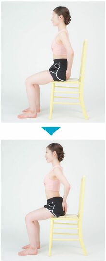 お尻の筋肉は前述の「足の裏3点」と一緒に働きます。ですので、座った状態で少し腰を浮かし、お尻の筋肉をしっかりつかんで引っ張り上げましょう。