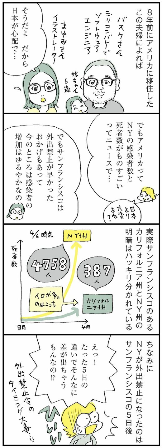 ライフ #ほしいのは「つかれない家族」 前の記事 次の記事 外出禁止の国に「日本はヤバい」と心配される訳 サンフランシスコの感染増加が緩やかな理由 3分で読める 公開日時:2020/04/11 05:30 ハラユキ イラストレーター、コミックエッセイスト フォロー 1/7 PAGES 2/7 PAGES 早い決断で感染増加を緩やかにしたサンフランシスコ 次ページが続きます:【早めに外出禁止にできたのは、◯◯の聖地だったから】 3/7 PAGES 4/7 PAGES 5/7 PAGES 6/7 PAGES 7/7 PAGES