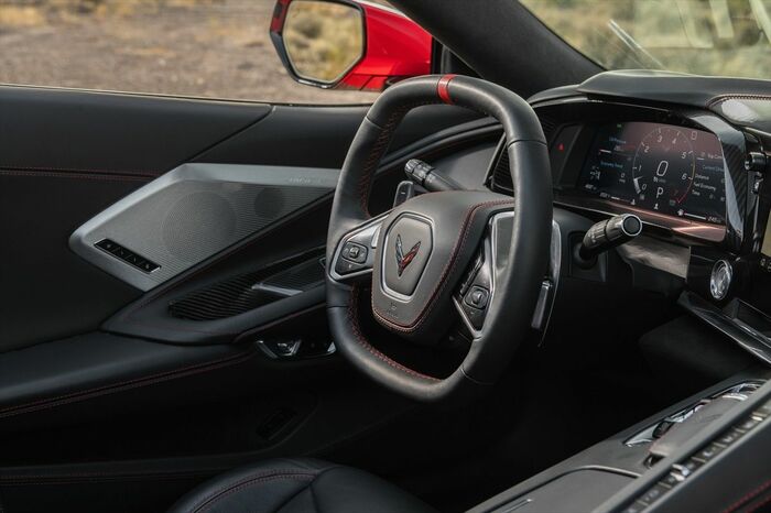 ステアリングを握ってみると、新型コルベットは操舵と同時に旋回が始まるかのような軽快な身のこなしが、まず鮮烈だった。特徴的だった長いボンネットを見ながらのコーナリングより断然、軽快な印象が強まっている。