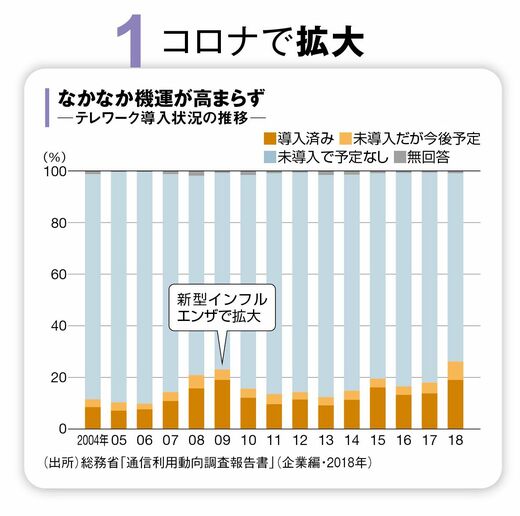 だが、必ずしもそうした企業ばかりではない。緊急事態宣言下での“半強制的”な在宅勤務が終わると、今後テレワーク実施率は低下していくだろうと専門家は指摘する。「テレワークはかつて新型インフルエンザ流行後の2009年、一時的に伸びたが、その後低下した経緯がある」。そう解説するのは、パーソル総合研究所の小林祐児主任研究員だ。