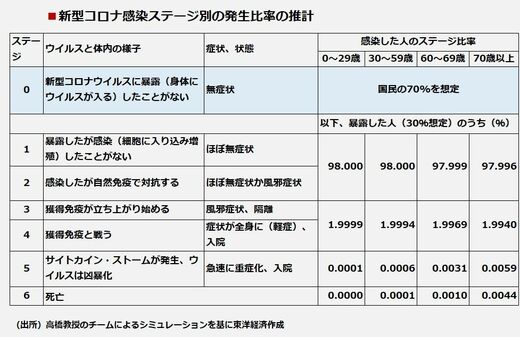 獲得免疫が出動(抗体が陽性になる)するステージ3、ステージ4に至る人は暴露者の2%程度で、そのうち、サイトカイン・ストームが発生して重症化するステージ5に進む人は、20代では暴露した人10万人中5人、30~59歳では同1万人中3人、60~69歳では同1000人中1.5人、70歳以上では同1000人中3人程度ということになった。