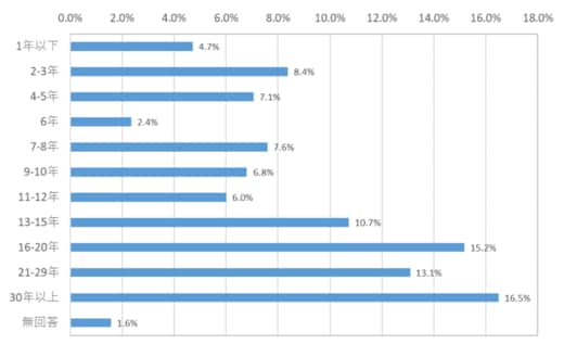 以下の「アニメーション制作者実態調査 報告書2019」にある「アニメーション制作としての仕事経験年数」別の人数割合を参照して欲しい。