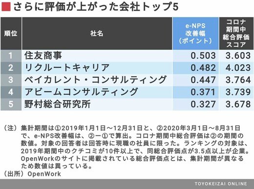 そこで2019年の総合評価点が3.5点以上と高い企業の中から、コロナ禍にe-NPSを維持・改善した企業の上位5社を抽出した。従前より社員から選ばれる企業づくりをしているのにもかかわらず、非常事態でさらに評価が高まったということは注目に値する。