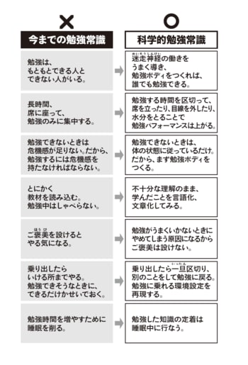 科学的な勉強常識では、「脳神経の迷走神経の働きをうまく導けば、誰でも勉強できる」「勉強する時間を区切って、目線を外したり、席を立ったり水分をとると、パフォーマンスが上がる」「勉強できないときは体の状態に従っているだけだから、勉強にふさわしい脳と体の状態を用意すればいい」「学習は、不十分な理解のまま、学んだことを言語化、文章化する」となります。