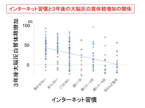 すると1回目の検査時では、大脳灰白質体積に群間差はなかったのですが、3年後にはインターネット習慣に応じた発達の差が認められたのです。