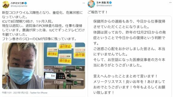 これまでコロナ感染した芸能人たちは、感染したことへの批判を恐れてか、「SNSなどで簡単に症状を説明し、復帰の報告をするだけ」という人が大半を占めていました。ここに来て積極的に語りはじめた理由は何で、どんな発言をしているのでしょうか。