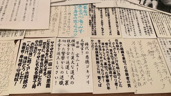 原田氏の行動は市民らの支持を受ける一方、自宅には原田氏を批難する封書やはがきが殺到した。その数は、数百通。その一部を原田氏は今も保管している。いずれも、罵詈雑言の嵐である。