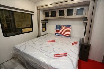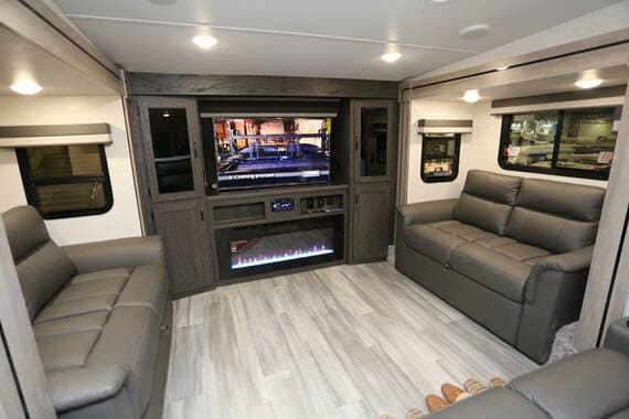 室内レイアウントは、前方エントランスから入ってすぐの車体中央部にダイニング兼キッチン、車体前方側にはシアタールームとしても使えるリビング、車体後部には1520mm×2030mmのクイーンズベッドが設置されたベッドルームといった3つの部屋で構成されている。さらにキッチン橫には、洗面台やトイレも備えたバスルームも配備する。
