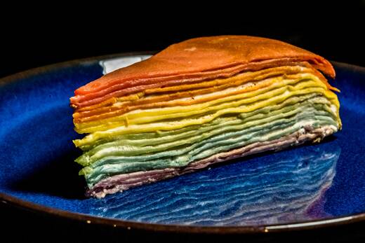 前述した「レインボーミルクレープ」は、その名の通り、天然色素でつくった層状の虹色クレープとして人気だ。企画したのは鈴木社長で、その意図をこう語る。