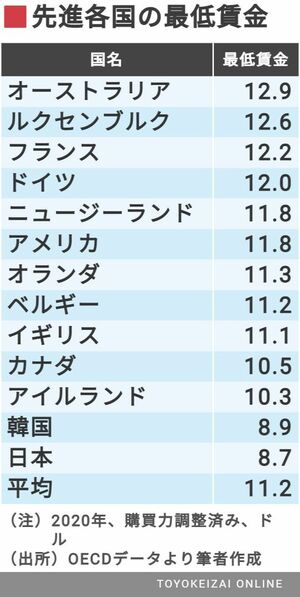 実は、先進国の最低賃金は一定の水準に収斂していることがわかりました。OECDのデータによると、日本を除く大手先進国の購買力調整済み最低賃金は平均11.4ドルです。2001年では、最も高い国の最低賃金は最も低い先進国の3.6倍もありましたが、2020年では1.6倍まで近づいています。