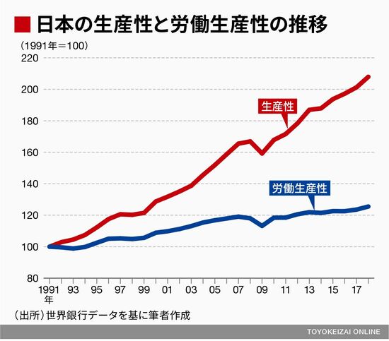 イタリアと同様に、日本も生産性が上がりましたが、労働生産性の低迷は極めて顕著です。労働生産性が上がっていないのに、生産性が上がっているのは、その間に労働参加率が上がったことを意味しています。