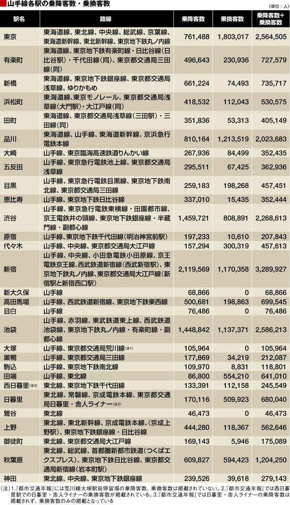 なお、山手線とは正式には品川から渋谷、新宿、池袋を経て田端に至る路線を指す。しかし、ここでは環状運転を行っている山手線の電車が走る路線の全29駅のデータを集計した。乗降客数はJR東日本の駅の数値はもちろん、乗り入れる他の鉄道会社の駅の数値も合わせている。