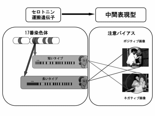 私は、脳内で感情や気分を安定させるはたらきをしているセロトニンという物質に着目しました。このセロトニンのレベルを保つ「セロトニン運搬遺伝子」は、人によって三つのタイプがあり、それが、楽観、悲観の性格を決めているのではないかという仮説をもって、このタイプと、その人が楽観的か悲観的かわかる認知バイアスとの関係を調べたのです。