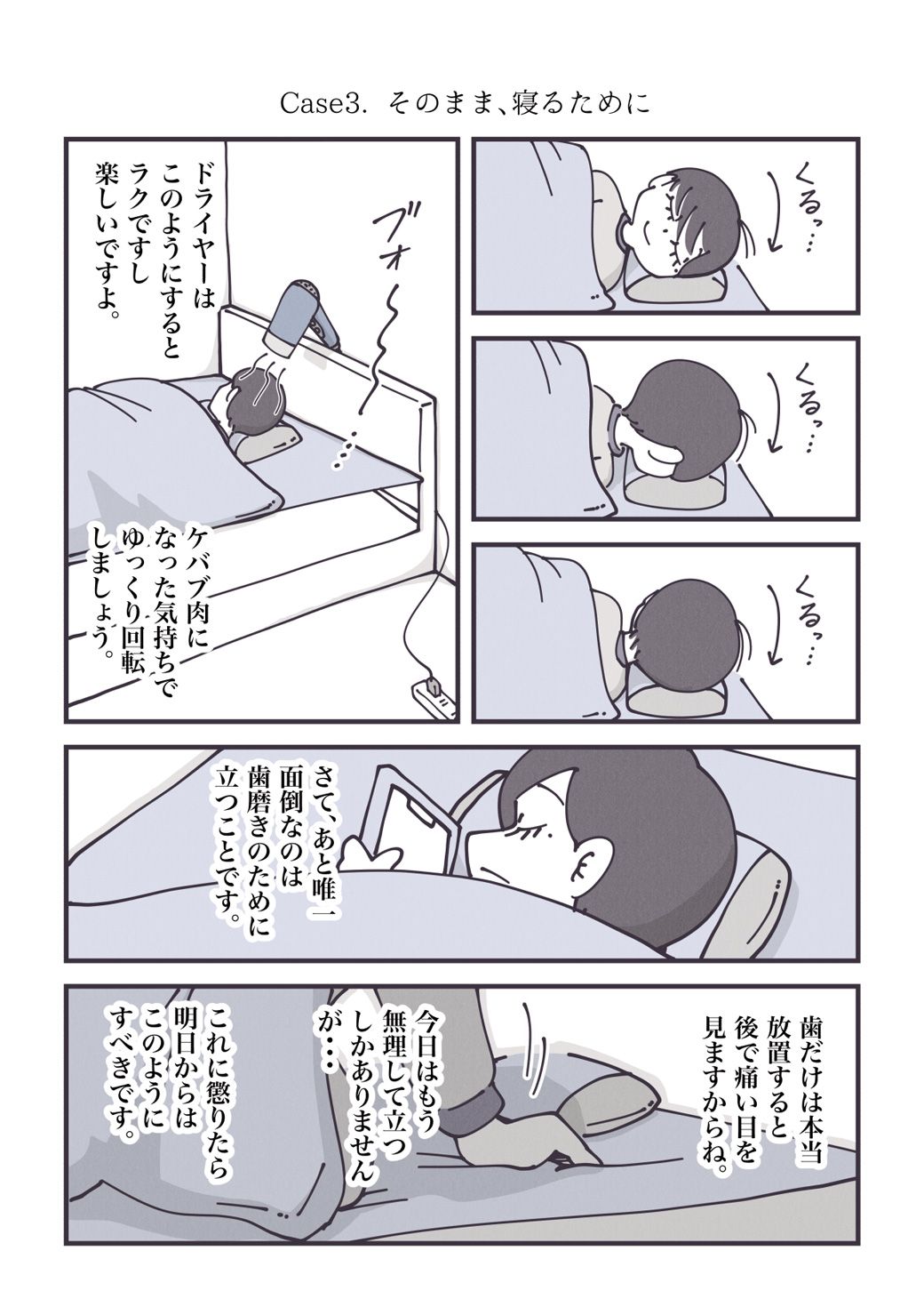 「もう、動けない・・・」風呂上がりの"だらだら"を撃退する禁断のワザ ドライヤーはケバブになった気持ちで・・・ 漫画「丁寧ならぬ暮らし」75話
