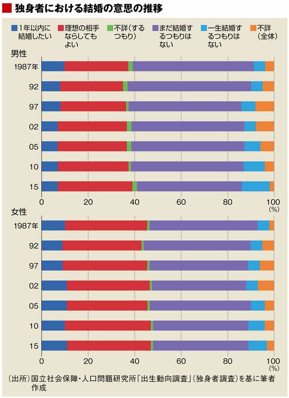 「いずれ結婚するつもり」と答えている人の比率は、決して「結婚したい」という意思や希望を持っている人の比率と同じではありません。しかも、この設問は、選択肢が「いずれ結婚するつもり」か「一生結婚するつもりはない」の二者択一です。どちらかを選べと迫られたら、現段階で「一生結婚するつもりはない」という強い意志を持つ人以外は、結婚する意思や希望の有無に関係なく、「いずれ結婚するつもり」を選ぶしかなくなるのではないでしょうか。