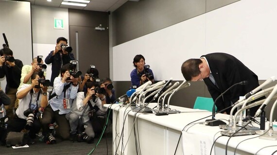 記者会見で頭を下げるSUBARUの吉永泰之社長。完成車の無資格検査を発表した(撮影:尾形文繁)