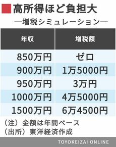 今回の給与所得控除の見直しは、給与所得控除を全員「10万円」減らすものの、課税前の給与収入が850万円超の人には控除上限を「195万円」とし、850万円より給与収入を多く得ても控除は増えないことにする、というものだ。基礎控除が10万円増えることと合わせて控除額をみれば、”課税前給与収入が850万円超の人”は増税となる。