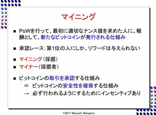 中島:これからは先細りです。それをやるのがマイナー、つまりマイニングをする人というか企業です。ビットコインでは、マイニングをやらないと取引が確定しません。前のブロックのデータを使って計算をしないと安全性が確保できませんから。途中改ざんができないようにするための仕組みなので、必ずやらなければなりません。