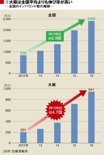 2016年に日本を訪れた外国人は2012年比で2.9倍に増加。一方、大阪は全国の伸び率を大きく上回り、同4.7倍に拡大している(図表①)。