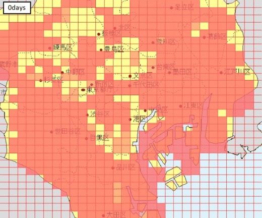 ■ 30×30メッシュ状のモデル:オープンデータをベースにしながら、東京都23区を30×30のメッシュ状にモデリング。中央防災会議⾸都直下型地震対策専⾨調査会が作成した震度予測データを利⽤し、震度に⽐例した被害を重要インフラごとに設定した(重要インフラの位置情報等については、正確な情報が公開されていないため仮説を含む)