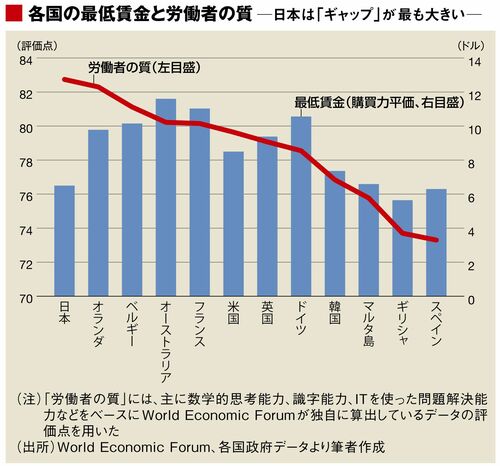 日本人労働者の質は世界第4位で、大手先進国の中ではトップです。であるにもかかわらず、日本の最低賃金は大手先進国の中の最低水準です。先進国だけで分析すると、労働者の質と最低賃金の間には85.9%もの相関係数が認められますが、日本だけが大きくずれているのです。