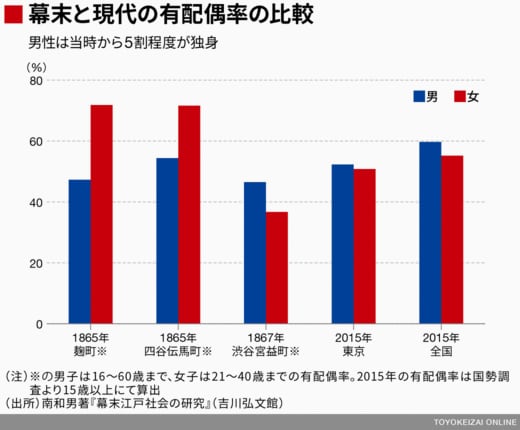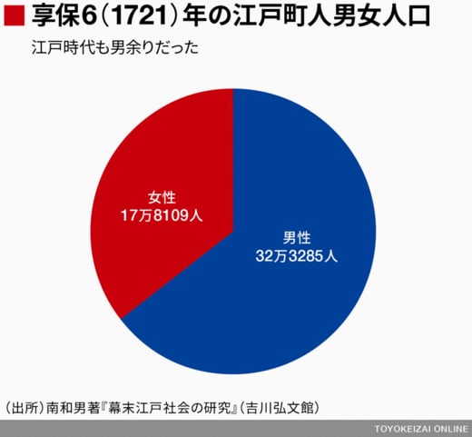 このグラフを見ておわかりのとおり、男女で有配偶率が大きく違います。それは、江戸が相当な男余りの都市だったからです。1721(享保6)年の江戸の町人人口(武家を除く)は約50万人ですが、男性32万人に対し、女性18万人と圧倒的に男性人口が多かったのです。女性の2倍、圧倒的に男余りでした。つまり、江戸の男たちは、結婚したくても相手がいなかったのです。「茨城県が1位!『ニッポン男余り現象』の正体」という記事にも書いたとおり、現代の日本も未婚男性が未婚女性に比べ300万人も多い男余り状態です。江戸と今の日本はとても似ていると言えます。