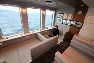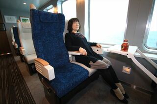 船内には、船としては珍しいリクライニングシートの席もある。こちらは本当に列車の座席さながら。リクライニングはもちろんだが、前の座席背面に折りたたみテーブルが設置されているところもよく似ており、もしかしたらどこかの列車の座席をそのまま持ってきたのでは?なんて思ってしまう。